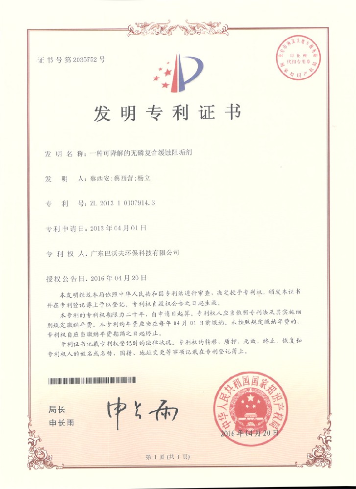 巴沃夫-發(fā)明專利證書